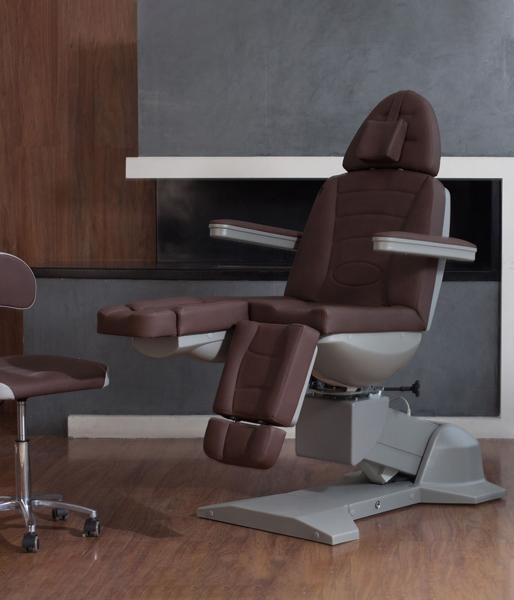 Педикюрное кресло оснащено тремя электромоторами, обеспечивающими регулировку высоты, угла наклона спинки и угла наклона сиденья. Опоры для ног фиксируются при помощи газ-лифтов. Кресло легко раскладывается в горизонтальное положение, образуя ровную поверхность. Надежная конструкция системы подъема обеспечивает высокую устойчивость кресла даже при максимальной высоте. Откидывающиеся подлокотники делают более удобным процесс посадки клиента. Управляется при помощи ручного проводного пульта. Дополнительно при производстве могут быть установлены различные опции.